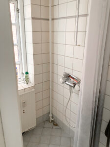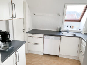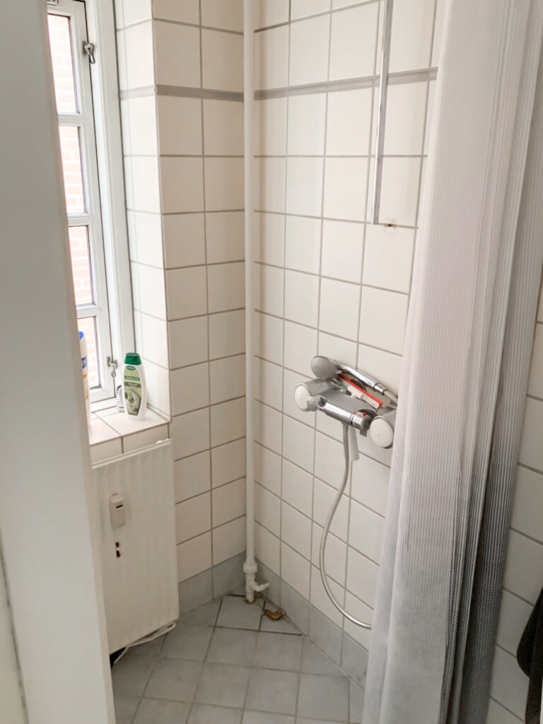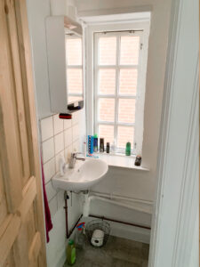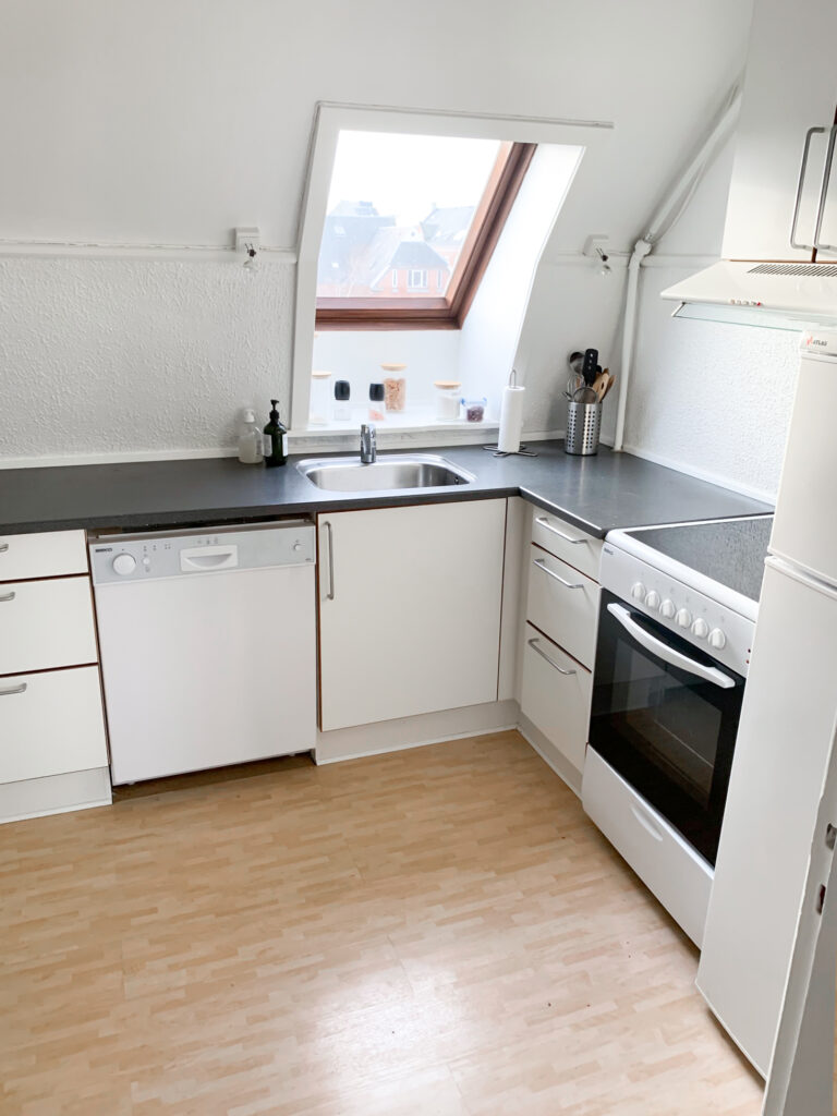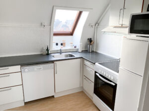 Køkkenet med gode skabe til opbevaring og de skrå vinduer giver rummet lidt ekstra charme, her findes naturligvis også opvaskemaskine, komfur, emhætte, køleskab og direkte adgang til bagtrappen, som leder ned til kælderen, hvor der findes vaskemaskine og fint kælderrum til opbevaring.