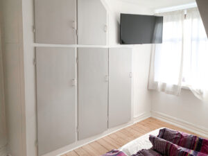 I det lyse soveværelse finder man gode opbevaringsmuligheder. Soveværelset ligger desuden ugenert med udsigt til gården.
